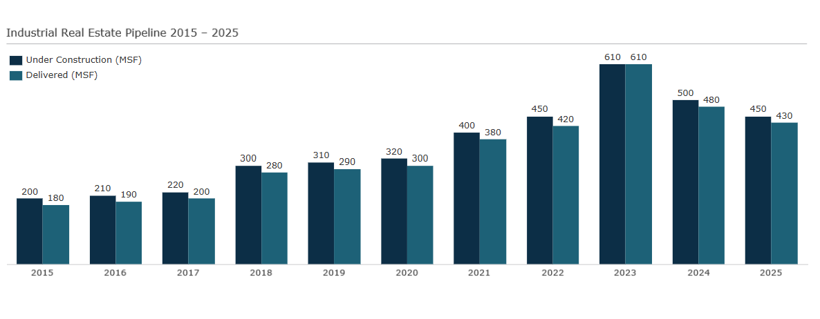 The 345MSqFt of industrial space under construction is down significantly from the levels seen two years ago, but more in line with a longer-term trend after the spike in new supply seen in 2023.