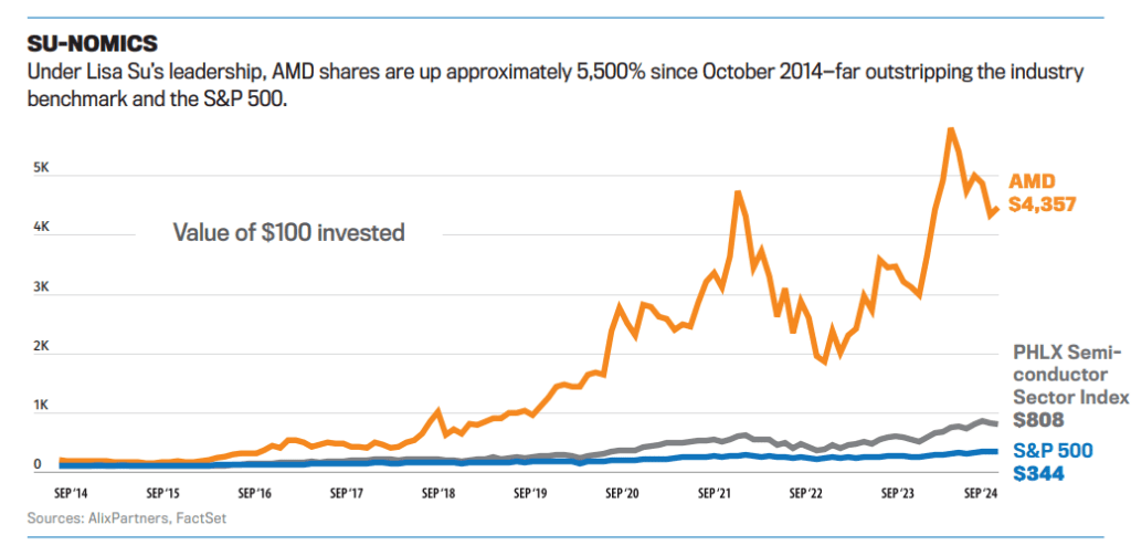 Over the next decade, Su and her team found that success as part of the most profound turnaround in the technology industry since Steve Jobs returned to Apple. Under Su’s leadership, AMD moved from industry also-ran and Nasdaq flatliner to the front of the pack, earning a blistering 46.3 percent average annual total shareholder return versus 13.3 percent for the S&P 500 and 23.5 percent for the benchmark PHLX Semiconductor Index over the same time. More important, Su, 54, staked a claim on the key tech markets of the future, from the chips that train large AI language models to the big-iron CPU projects that run the world’s most powerful and sophisticated computers. And she’s done it with a balanced portfolio rather than an all-in bet on a single play, like AI.